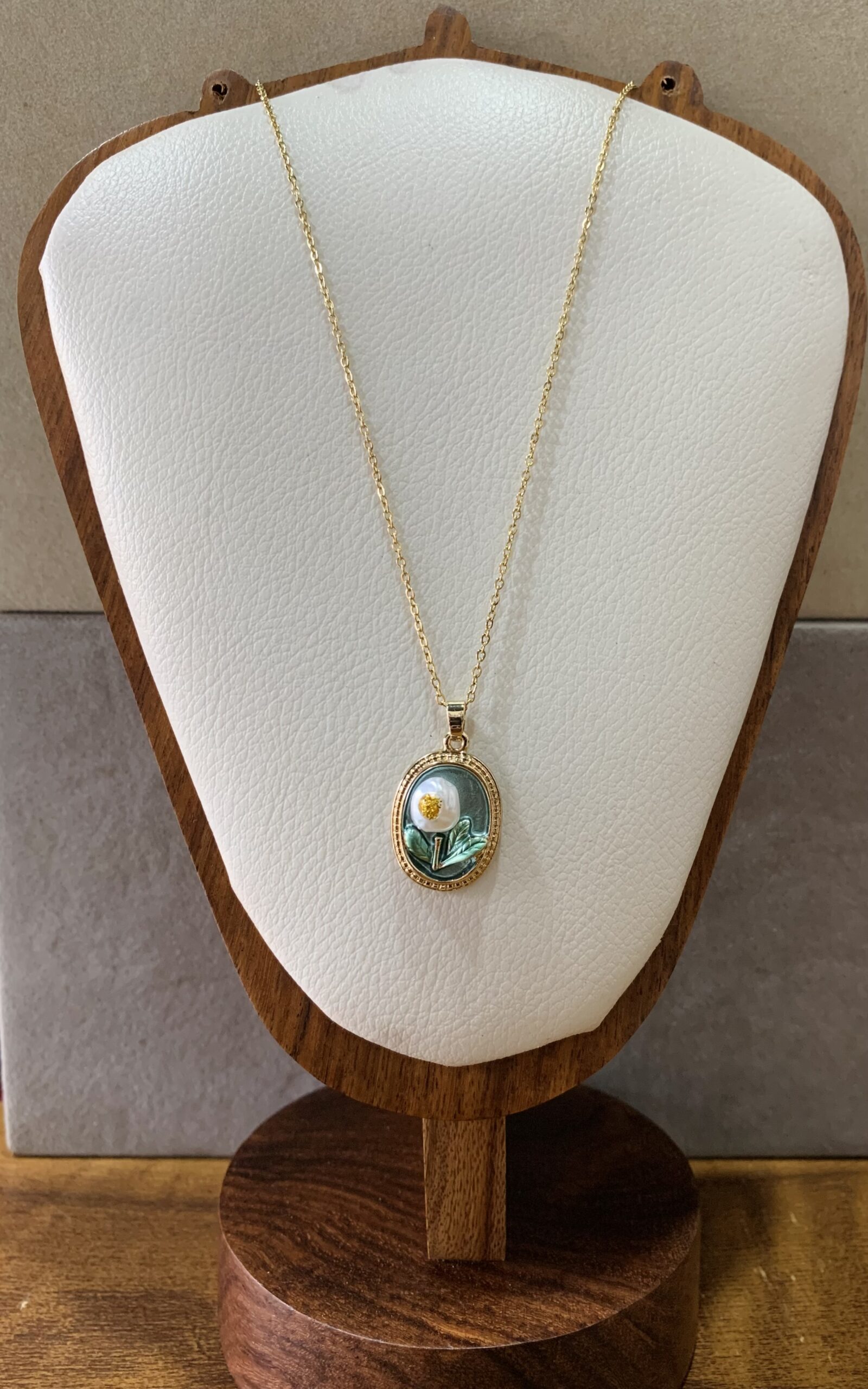 Gold chain necklace with an oval pendant featuring a pearl flower design. Elegant and delicate