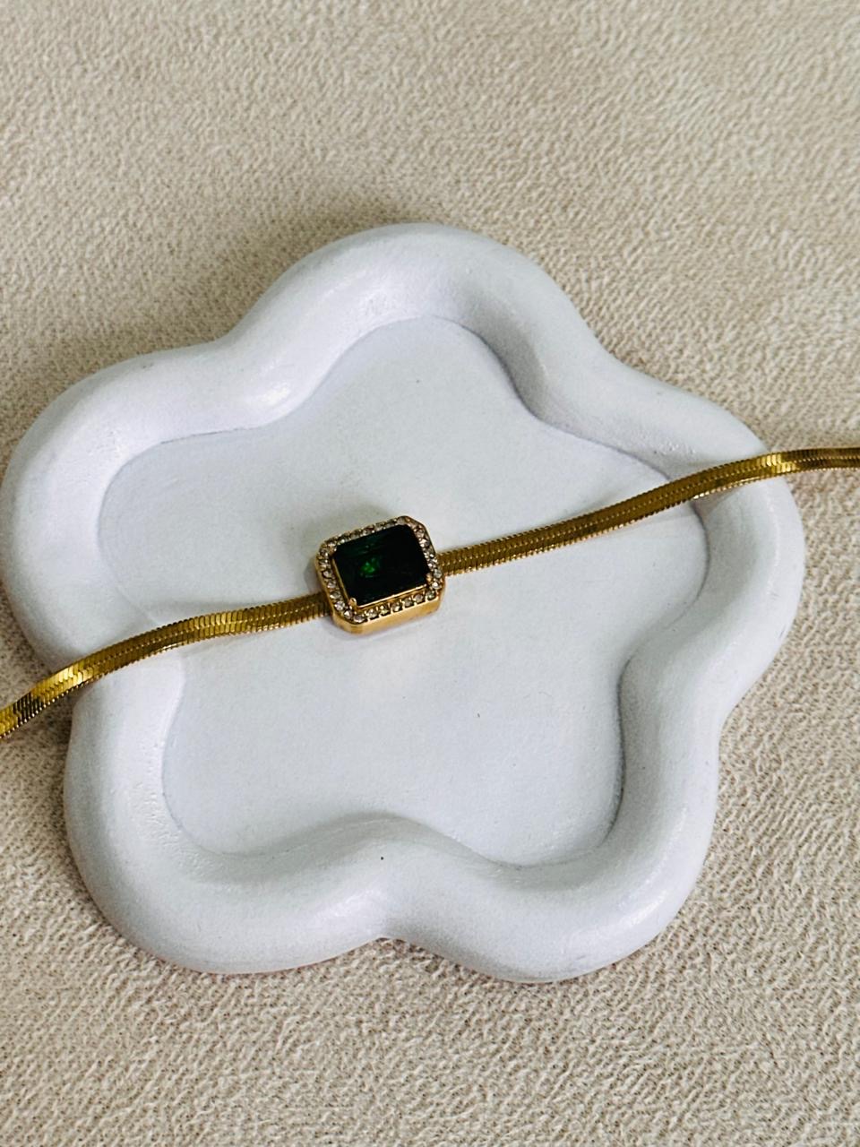 Design: Features a sleek, flat gold-toned chain adorned with a square emerald-green gem encircled by a border of clear, brilliant stones.