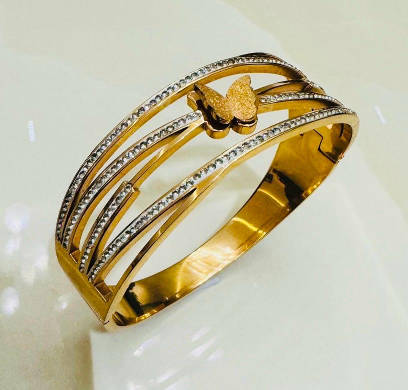 Delicate yet bold, the Flutter Grace Gold Bangle brings a graceful charm to your jewellery collection. Designed with a layered band structure and accented by a subtle butterfly motif, this piece is a blend of elegance and playful detail. Encrusted with fine crystal-like stones, it sparkles with every movement — perfect for both daywear and evening looks.