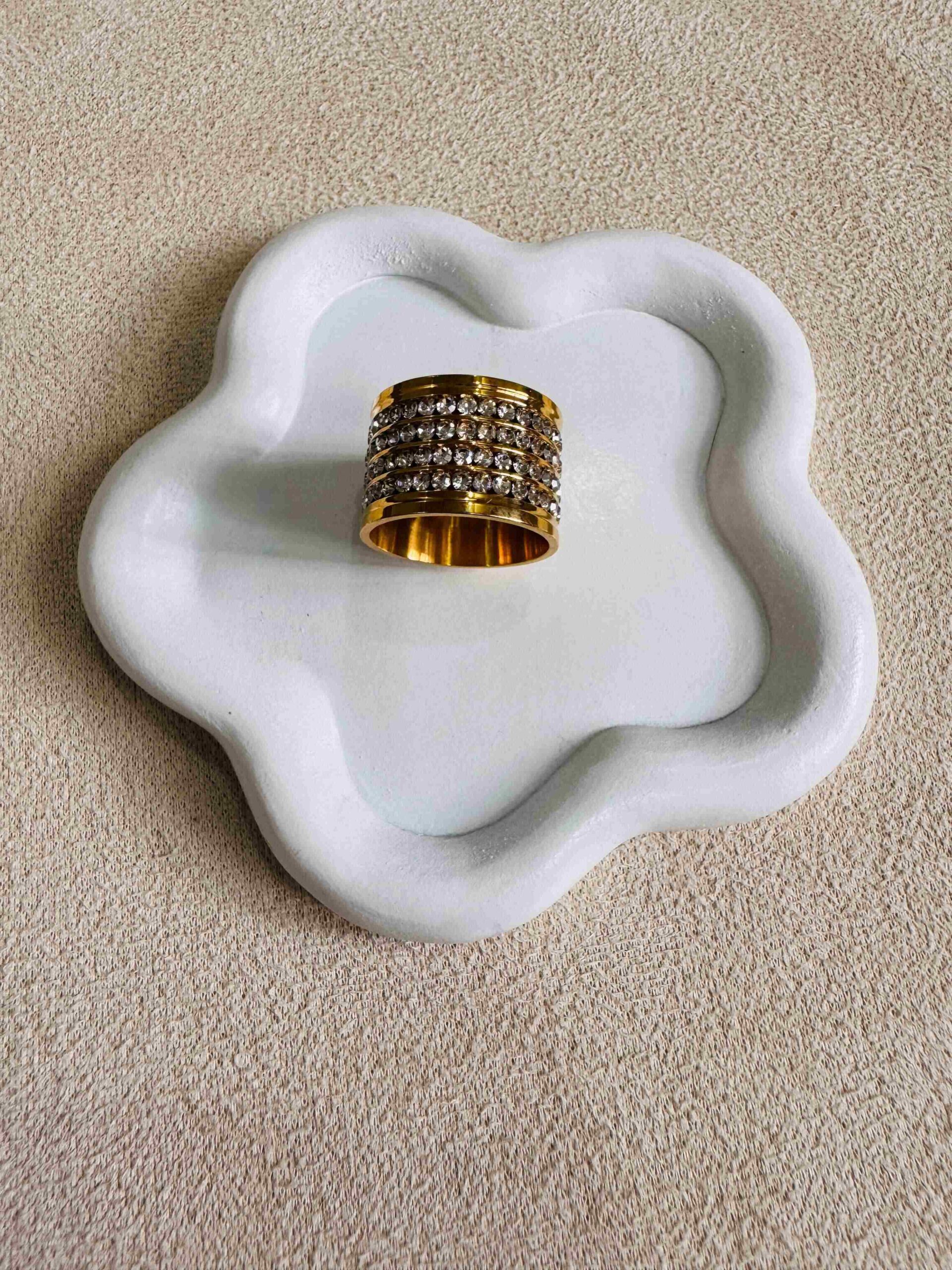 This bold statement ring features a wide gold band adorned with multiple rows of sparkling clear crystals. The intricate arrangement of stones adds a luxurious and eye-catching brilliance, making it the perfect accessory for special occasions or upscale everyday wear. Crafted for comfort, its wide design exudes elegance and sophistication.