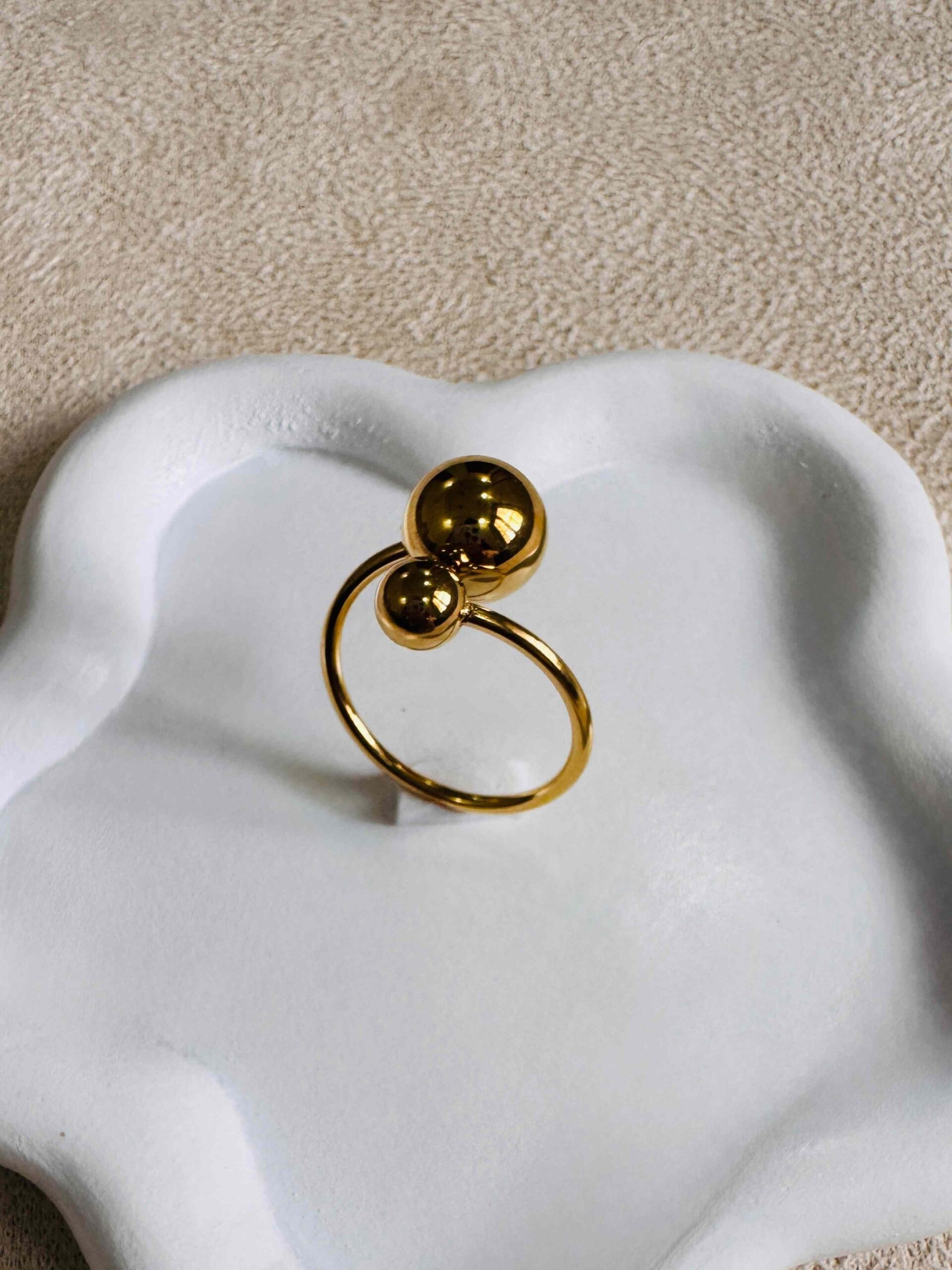 The Golden Duo Sphere Ring is a contemporary statement piece designed for effortless elegance. With its minimalist open band and two lustrous golden spheres of varying sizes, this ring creates a balanced yet eye-catching look. Its adjustable band ensures a comfortable fit, making it versatile for daily wear or special occasions.