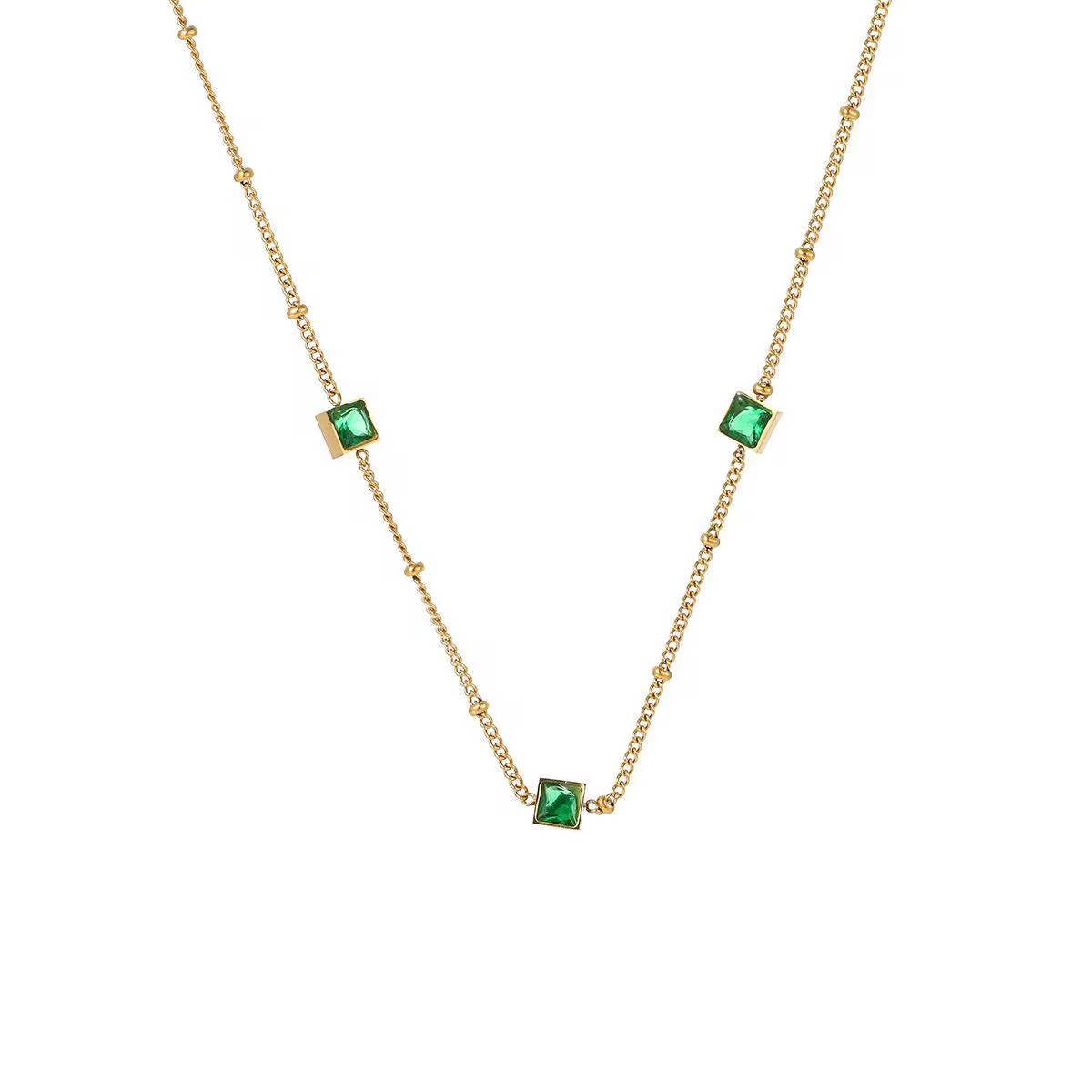 A delicate gold chain necklace  with three square green  gemstones spaced evenly along the chain, giving a stylish, minimalist look.