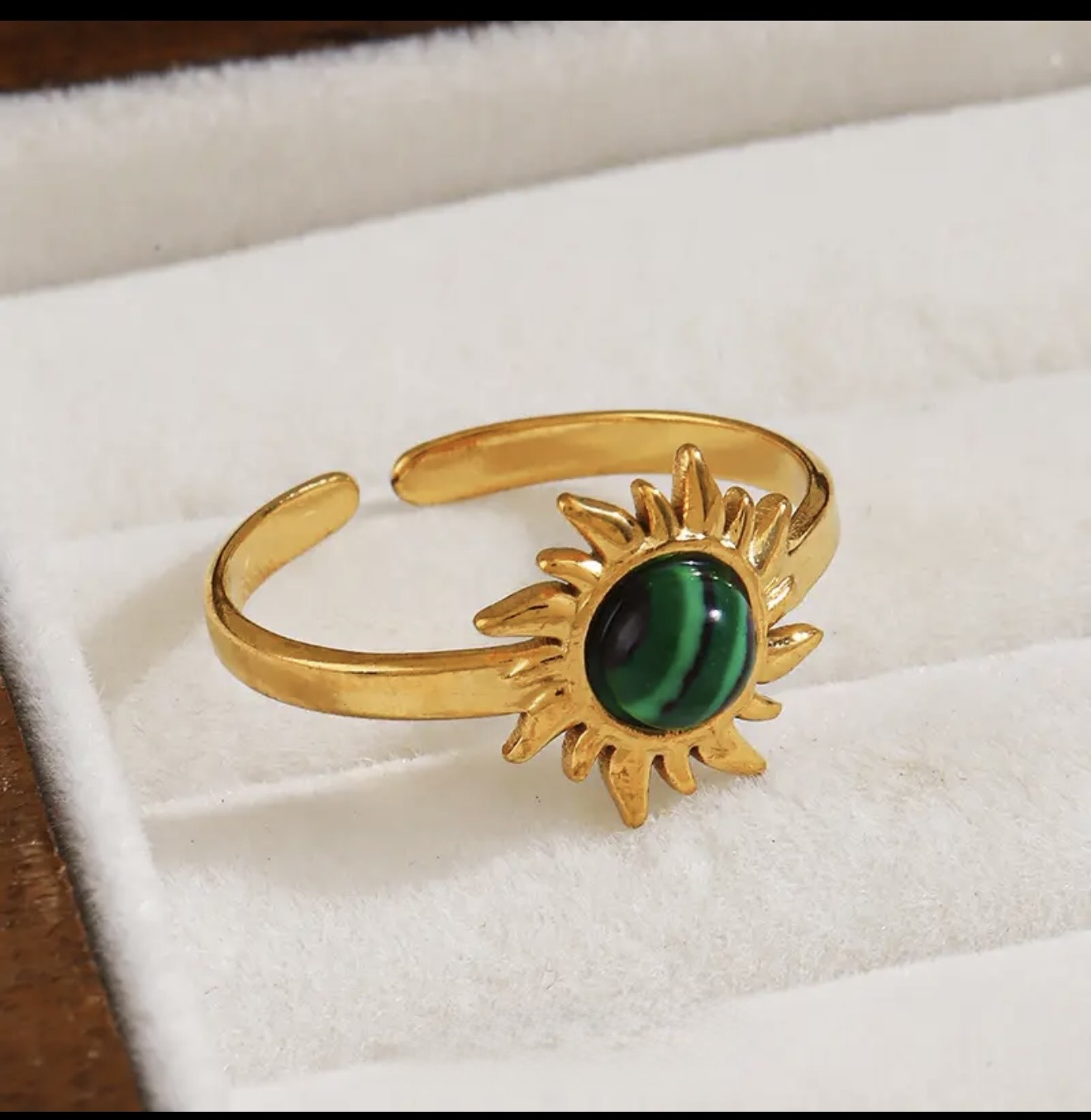 18k Stainless steel adjustable sunflower ring  with green colour stone