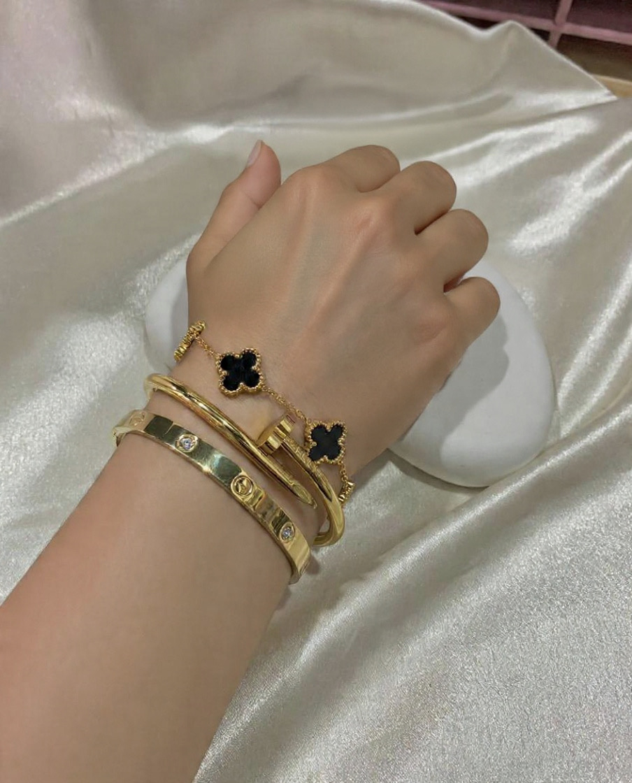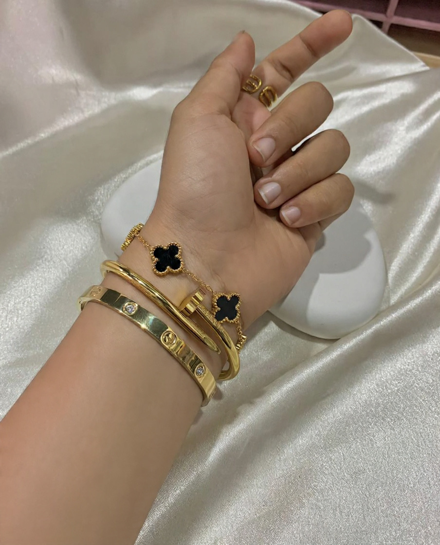 A beautiful trio combo of gold bracelets: a chain with black leaf clovers( big),a hinged gold bangle, and a gold cuff with gems and engravings