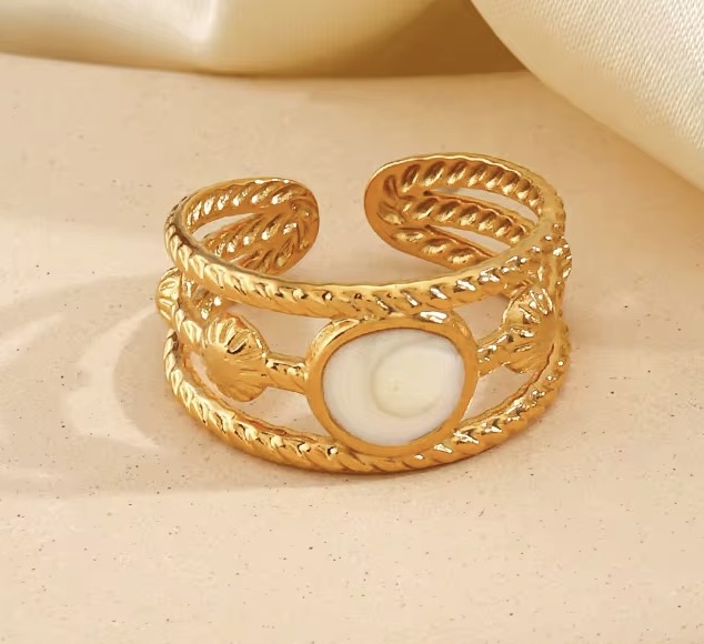 Elegant stainless steel gold ring with a white stone, wrapped in a braided design with a twisted rope pattern